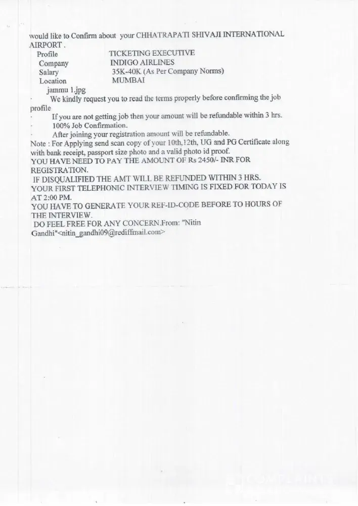 ANJU MADAM MO.7052664039. I have call him he said sent doc. so i send it. After that she told me you want to pay Rs.1600 reg.fee refundable. She send me SMS with bank details as under. I pay Rs.500 to that account. After that she demand Rs.7000/- for doc.verification & computer etc.. I have not paid that amount and request to refund fee. After that he send me appointment letter & Employee code. and demanding Rs.7000/-. I send mail to samsung co. he reply this is fake. So i send mail for refund my fee not reply.