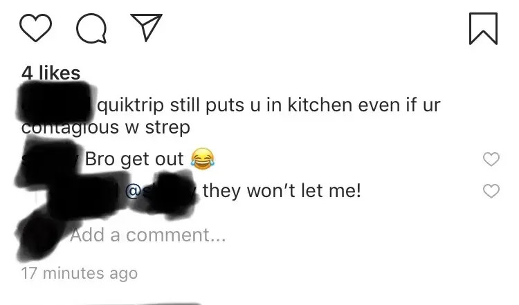 I am completely disgusted to know a QT worker on social media who is contagious with strep right now and is still being made to work in QT kitchens. You allow your contagious employees to work in the kitchens? She has been diagnosed with strep and is in the 2-3 week period of contagiousness. This is absolutely not okay. Not because she is telling and posting on her social media but because you guys force CONTAGIOUS employees to work and handle my food. I don't even want to step foot in a QT again i am disgusted. Please email me at [protected]@gmail.com