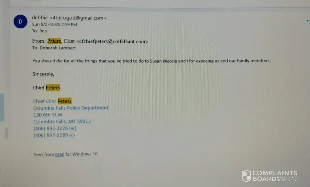 I got a death threat from the Columbia falls police dept susan Nicosia and their families and they killed my family and they tried to kill me at 1910 9th ave w Columbia Falls mt and they are still after me thinking they can get away with it.