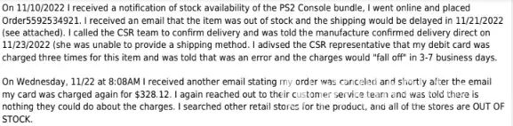 I placed an order for a PS5 Bundle on 11/10/2022 and was advised it would be delivered on 11/21/2022. I was later informed there was a delay from the warehouse and the delivery was confirmed for 11/23/2022.