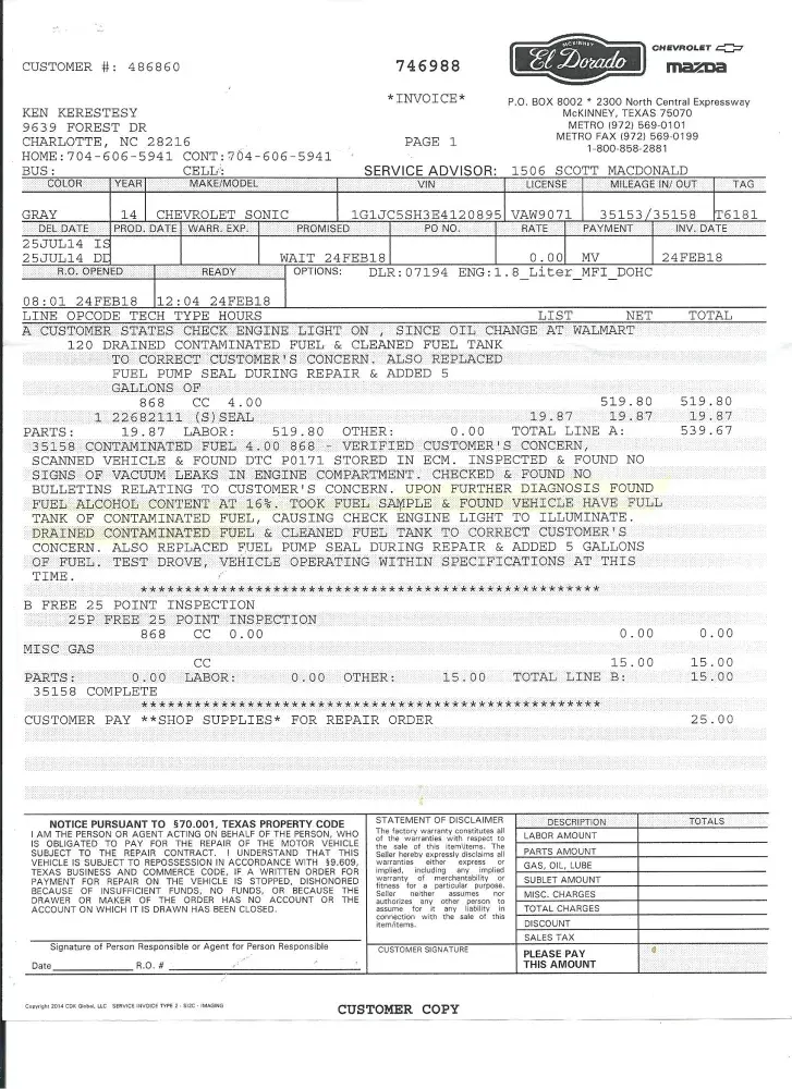 I drove less than 3 miles to my family member's home and parked the car. The next morning I started to leave when the engine light came on. I took it to El Dorado Chevrolet to have it checked. They tested and found that there was contaminated fuel in the gas tank. I spent 4 hours and $581.00 to have the tank removed, cleaned and new gas put into the tank. (Receipt for gas and bill from El Dorado Chevrolet attached). After I left the dealership I returned to the gas station to make them aware of the situation. They told me they had no other complaints and to contact the home office. Ironically, the fuel tanker was at the station filling the tanks at that moment. Apparently the day before I got the gas/water at the bottom of the tank. This was quite an expense that I did not anticipate and I am looking for compensation.