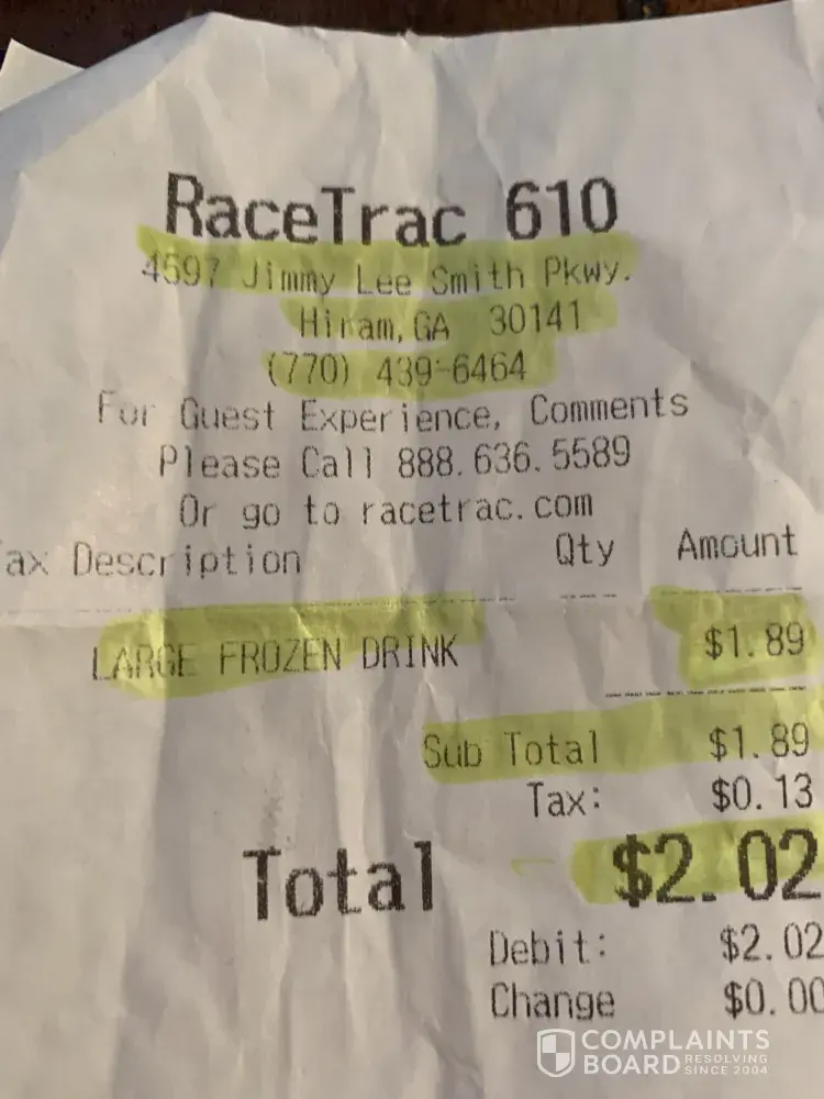 The price in front of the frozen drink dispenser say's $1.59 for large I got up to the register and the clerk charged me $1.89 plus tax $2.02 I complained so I went back to make sure that I read it right and I did $1.59 for a large I asked the clerk to come over and see it for himself and he did and insisted that there was nothing that he could do about it...