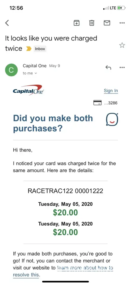 Hello I was at race track on power springs road and was charged twice $20 for my gas . I was told I was getting a refund and never got it and I've been getting run around since I just want back my extra $20 or $20 worth of gas I have my receipt and manager named Orlando suppose to be taking care of situation to no avail please help. I have both my receipt from my card statement and from day I got gas
