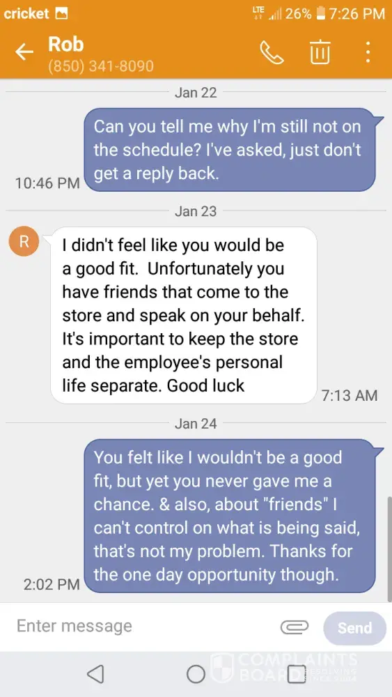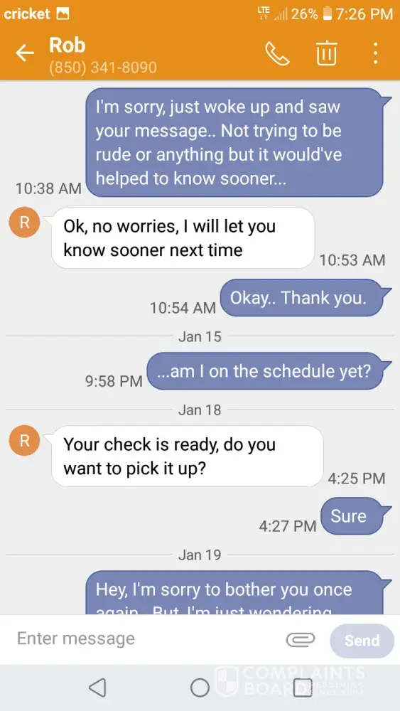 I'm filing a complaint about Rob, owner of Raceway, on US-90 Milton, FL. January 6th, Rob called me and offered me a job interview, & We set the interview for January 7th at 1:00p.m. Jaunary 7th, I get there 20 minutes early, & He's not there. A co-worker called him to let him know I was there, about 1:30p.m. he finally got there. We go inside, I do my...