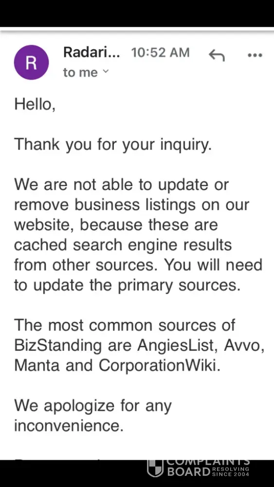 I've heard identical, dishonest replies to my requests for removal that they won't remove the listings "because these are cached search engine results from other sources." "I will need to update the primary sources " and then they repeatedly recommended BizStanding, their own company! I haven't been able to make any updates on BizStanding, which is why I'm in need of assistance but they've refused to help or to be honest!