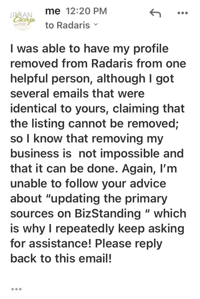 Radaris has 2 listings of my businesses on their company website BizStanding that need to be removed!