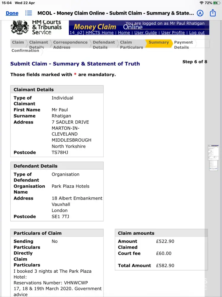 Sadly neither the above email sent on 30/03/20 nor several further emails has received any response. I have now prepared a submission to the County Court for full recompense of £522.90 plus Costs of £60. I have offered the hotel 14 days to respond before I proceed with submission.
