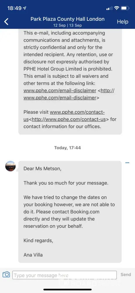 I recently booked a stay at London hotel "Park Plaza County Hotel" through booking.com. Unfortunately my husband is in the high risk group, as the restrictions changed in the U.K. we asked to change dates, this was agreed by the hotel (see photo attached) who said we needed to contact booking.com, which we did! Unfortunately your hotel refused to answer booking.com, ignoring their attempts to help us. As a result I've gone down as a no show and had to pay £149, which is disgusting considering your hotel knew we would not be showing up. I emailed the hotel for a refund providing all three photos of proof, how have been less then helpful and refuse to refund us, even though they can see all our emails and proof we followed their request. I think it's disgusting the hotel has clearly purposely ignored booking.com and has happily charged us, and to make the situation worse refuse to help or refund us, stating it's our fault still. I'm disgusted in these times a vulnerable person can not change their dates without being charged, and the hotel can just simply ignore their customers request they've just agreed, and charge them, and refuse a refund. All I want is a refund now, I don't see why it's so hard and why I'm suffering for the hotel ignoring the company, when they know full well they've got to authorise the change or it will be a no show and I'll be charged. (Which I did not know would happen until I was charged)