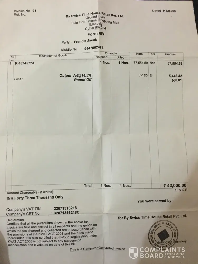 I am francis jacob from kerala has brought a rado watch and I am unhappy with the quality of product. I purchased the watch from your retailer by swiss watch boutique pvt. Ltd., lulu international shopping mall, edappaly, cochin