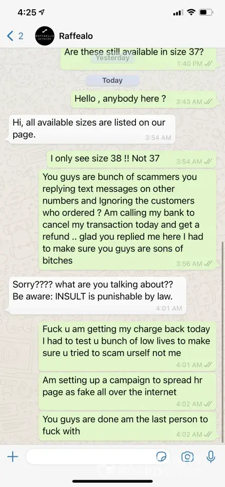 I contacted Raffaelo and had a very rude reply from someone called Dawn. The emails went back and forth and I was shocked at the rudeness of her emails.