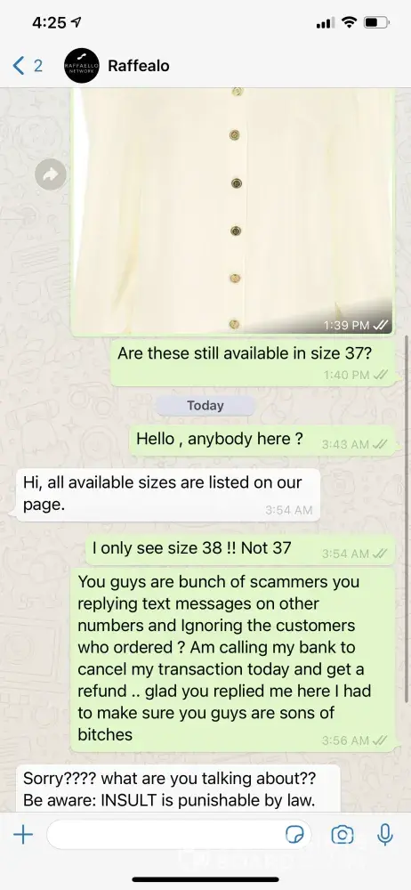 RAFAELLO NETWORK IT´S A FRAUD! I ORDERED A PAIR OF SHOES AFTER A FEW DAYS, THEY TOLD ME THAT MY PRODUCT WAS OUT OF STOCK. MY MONEY HAS NOT BEEN REFUND. IT IS A FRAUDULENT COMPANY DO NOT BUY AT RAFAELLO NETWORK