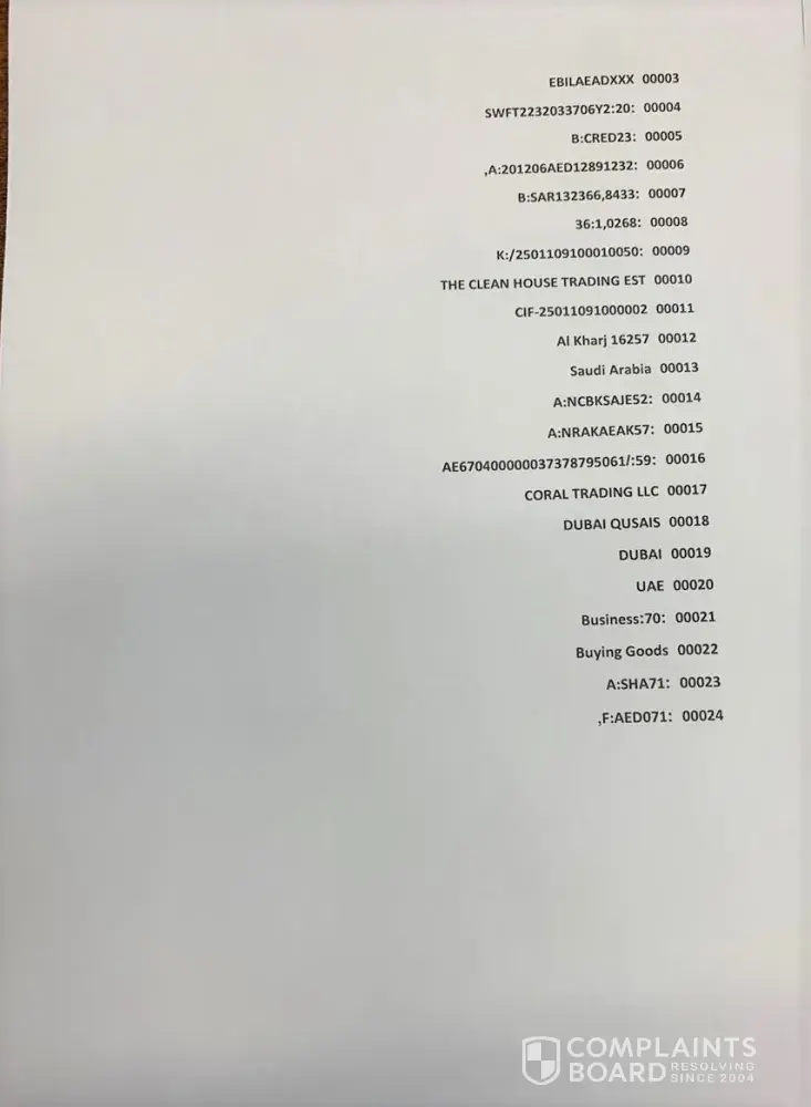 We, The Clean Home Trading Est., maintaining account with National Commercial Bank, Saudi Arabia remitted AED 128912.00 to M/s Coral Trading LLC maintaining account number AE670400000037378795061 in Dubai, the value date of the credit is 06.12.2020. The beneficiary has informed us that they have not received the remittance till now. We have also sent the swift copy of the remittance to the beneficiary which has been forwarded to your bank. The Swift reference number is [protected]. But your bank has informed the beneficiary that the amount has not been received without properly scrutinizing the swift record. We request you to look into the complaint and resolve the issue immediately by crediting the amount in the beneficiary's account.