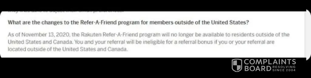 I continued asking for a solution by email until on November 13th I was surprised with a notice on the Rakuten website, informing that from that date, the bonuses in the Rakuten referral program would only be valid for residents of the United States and Canada (screenshot here: https://www.dropbox.com/s/ob3o7zdl0zfobx7/image0.jpeg?dl=0). I understand perfectly that the terms can be changed at any time, but I immediately asked about the refarrals made before the 13th, when the rules still did not restrict any nationality or address of the participants.