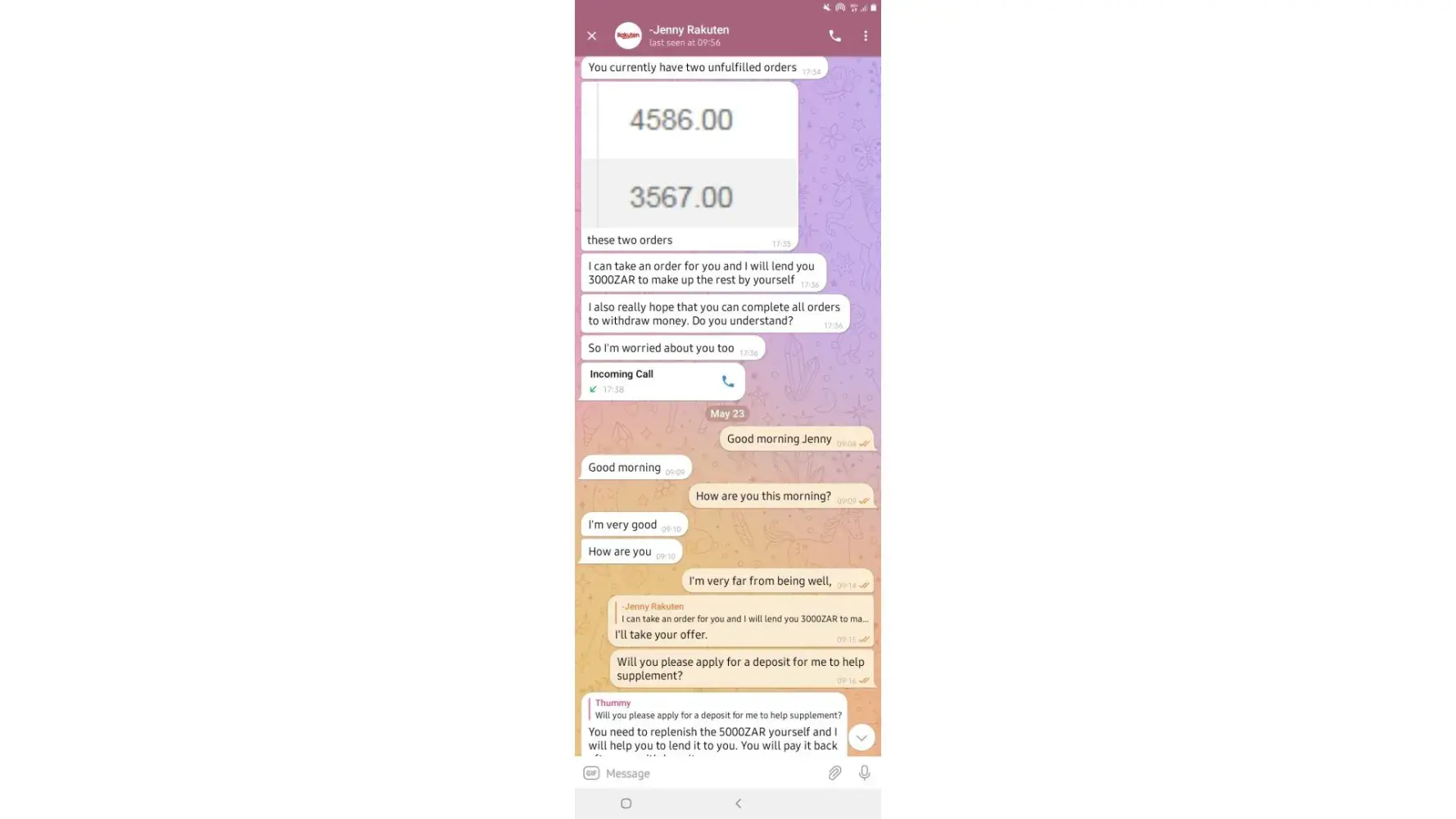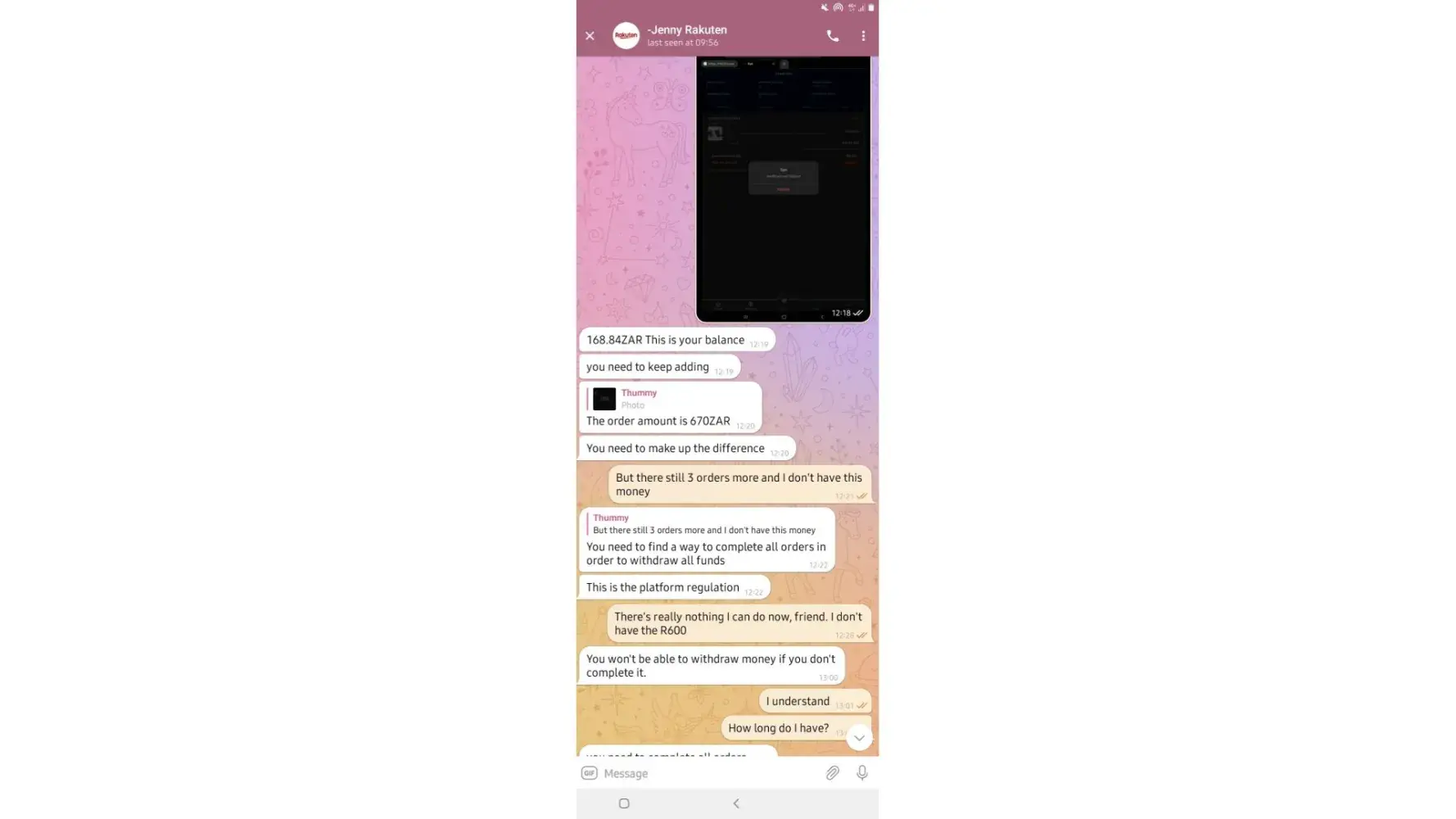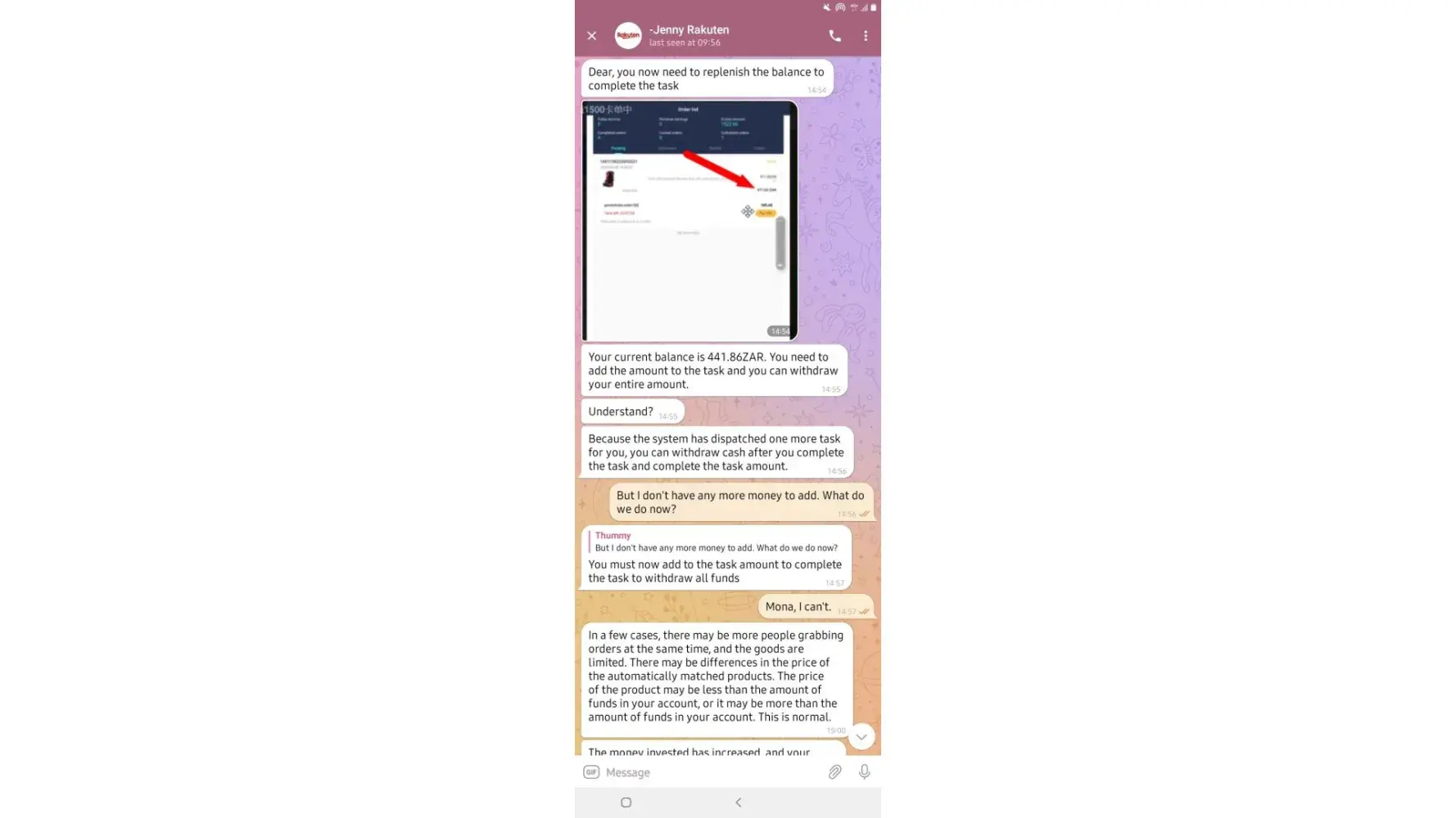 on 02/05/2022. which means losing all the money I put in which is R6 432. I have fully completed 7 orders and I'm left with one. Replenishing to pay for orders was not communicated by the customer service before I started this mission, I only got to know about it when it happened and I was told it was normal because the system just dispatches orders.