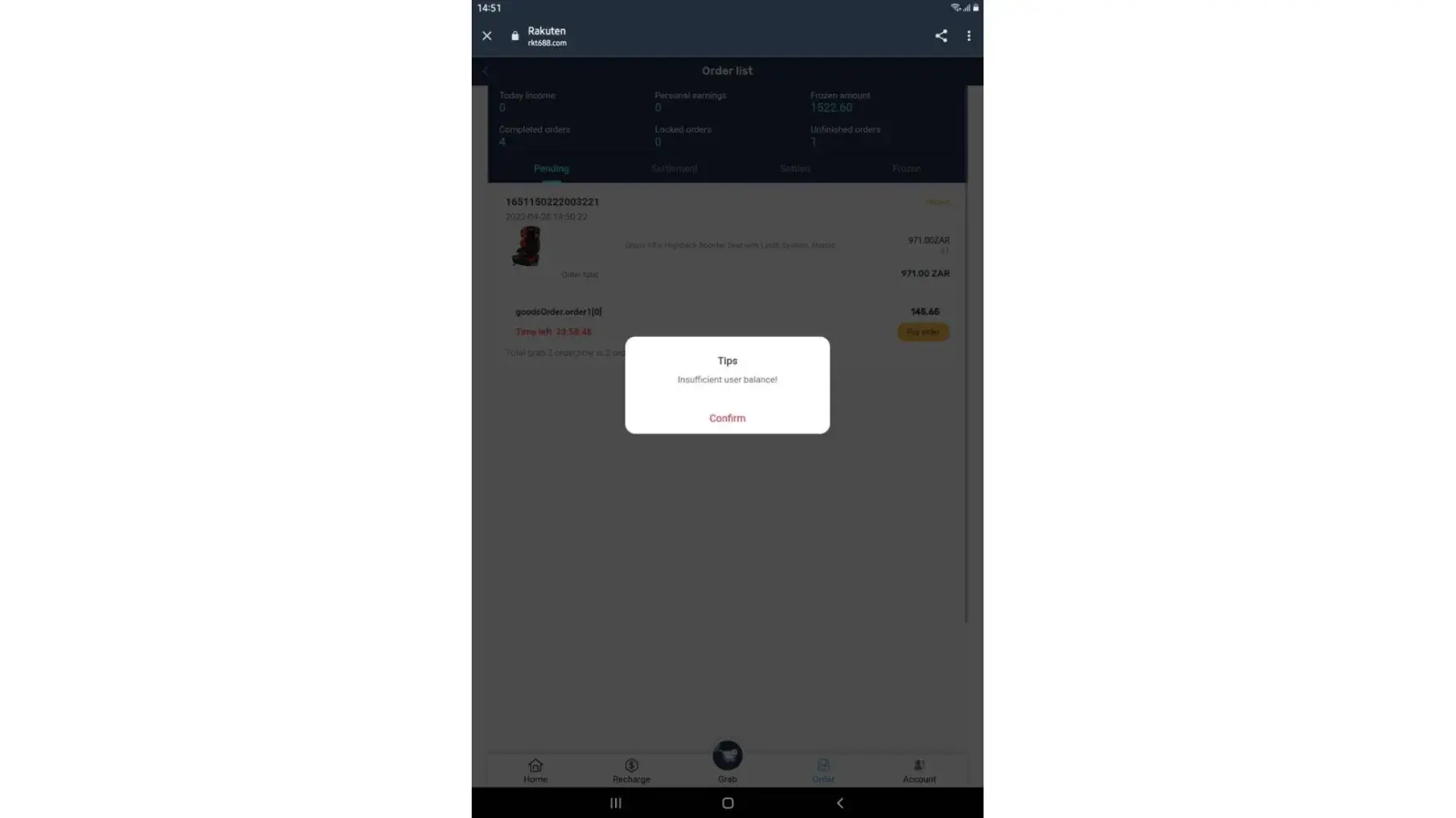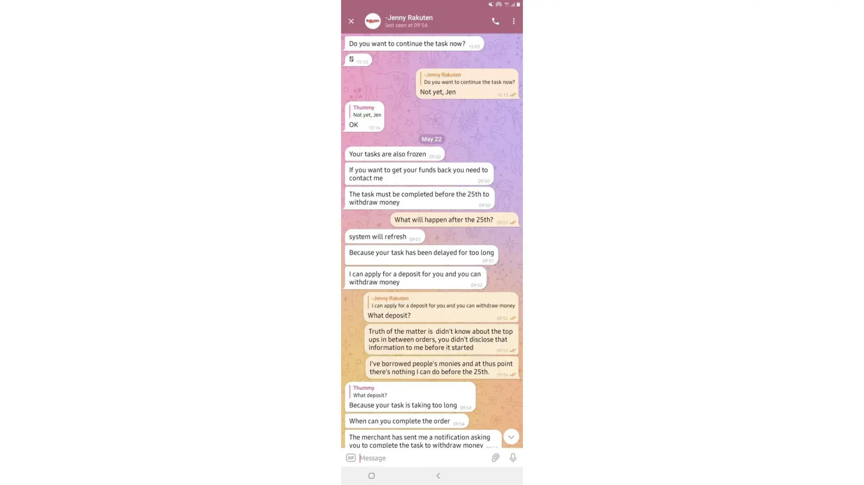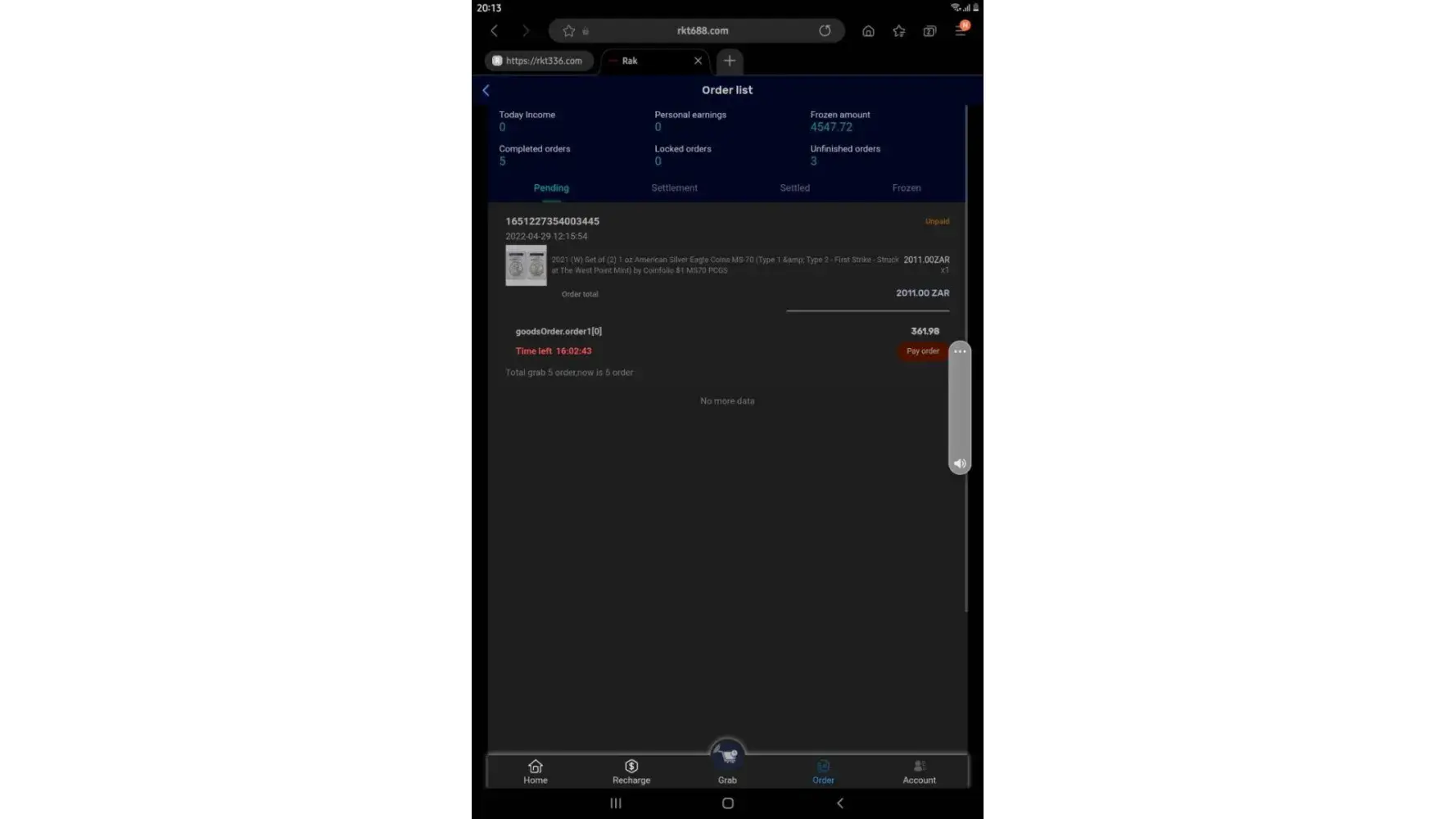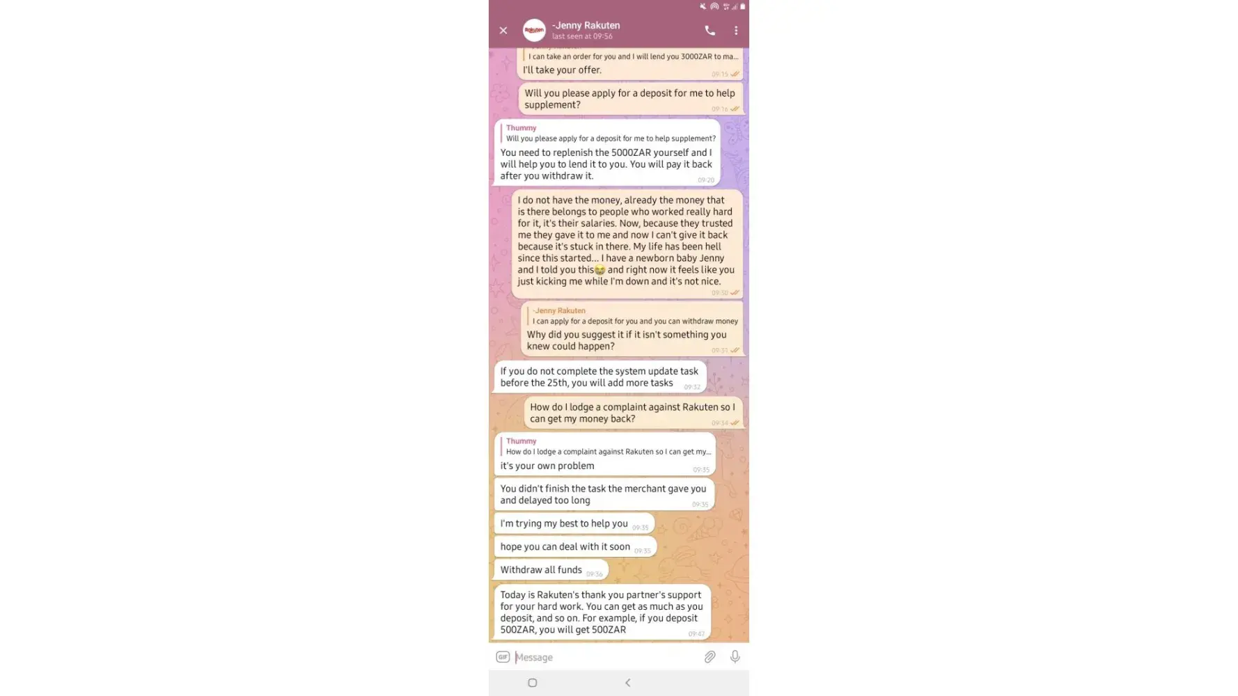 on 02/05/2022. which means losing all the money I put in which is R6 432. I have fully completed 7 orders and I'm left with one. Replenishing to pay for orders was not communicated by the customer service before I started this mission, I only got to know about it when it happened and I was told it was normal because the system just dispatches orders.