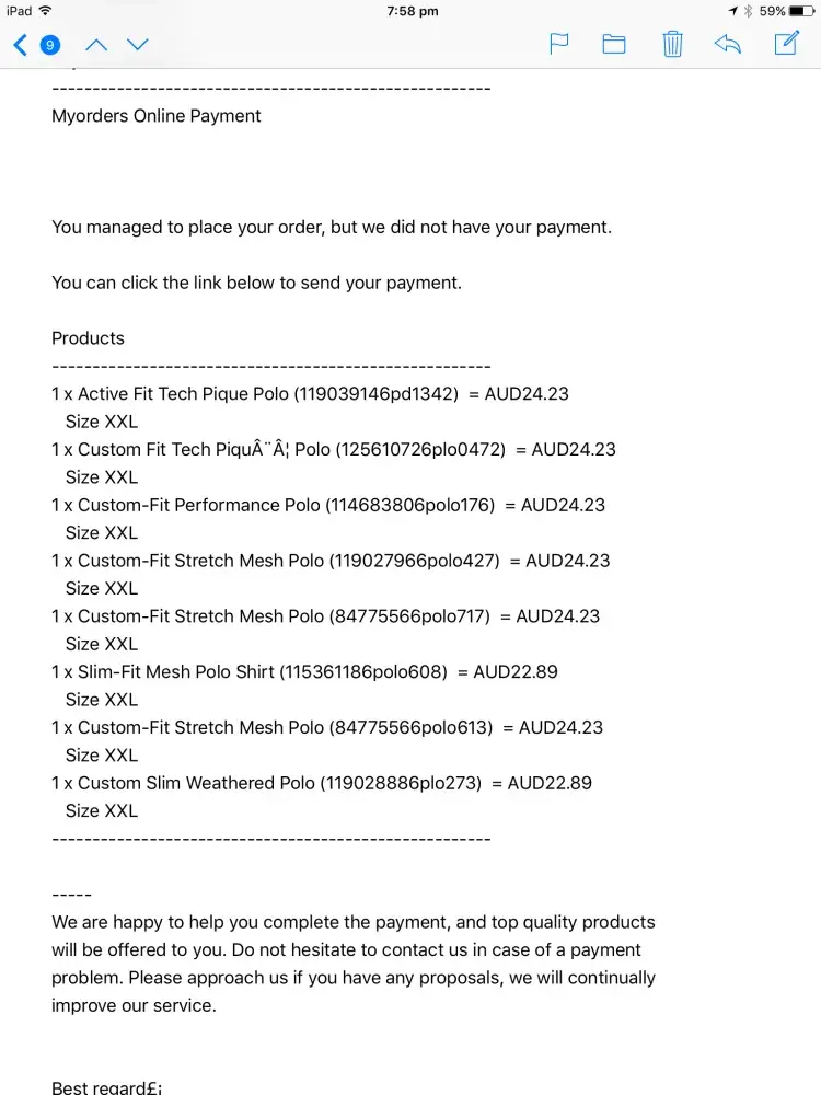 I paid for 8 polo shirts on line at a cost of $206 Aus dollars, I received only 1 shirt, I have send 5 emails only to have them bounce back, this is very poor service from such a big brand company, I only want what I paid for, but I'm starting to believe this is a scam company I can provide what you want to prove the payment and order, if I don't get any answers from you I will take this further, my email is [protected]@yahoo.com.au My number is