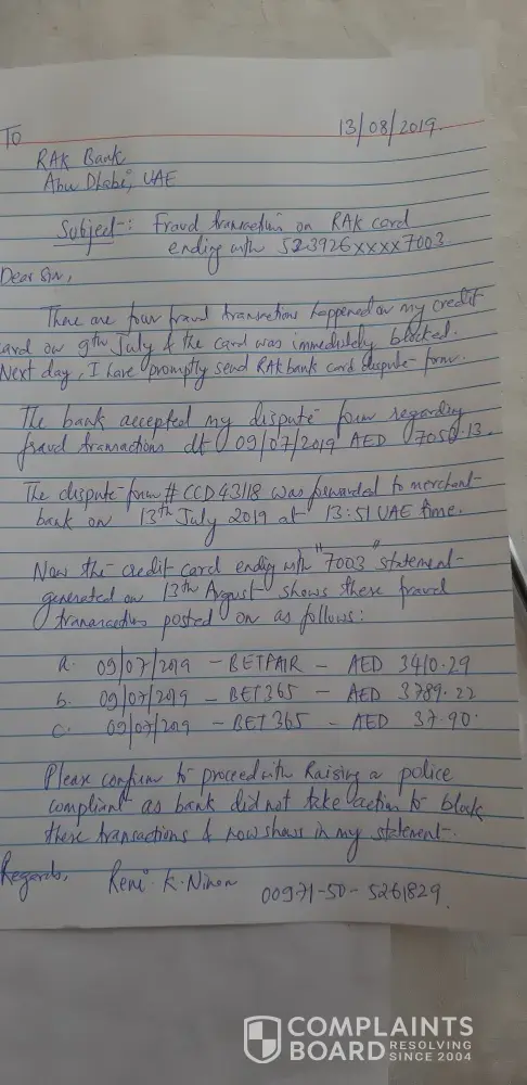 I have registered four fraud transactions and these shows up in my statement now inspite of the fact that RAK Bank card was blocked immediately and then card dispute was filled next day