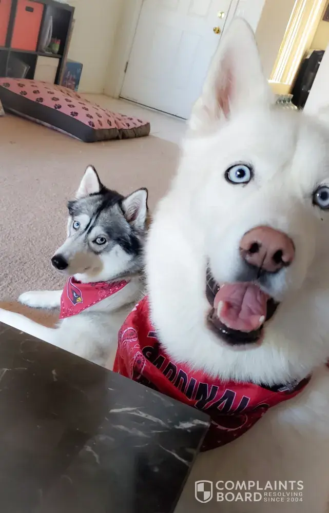I bought my Aurora from Annette in March 2018. She's been the most amazing husky I've ever owned! Her sister too (Luna, in front..purchased from another breeder in California)..Annette was wonderful to deal with. She made sure we arranged time for all FOUR of Aurora's parvo shots even though 3 is all that is required..Annette advised and strongly urged me that the 4th was important with so many cases. Aurora is now a happy, healthy and beautiful 2 year old husky and my best friend â¤