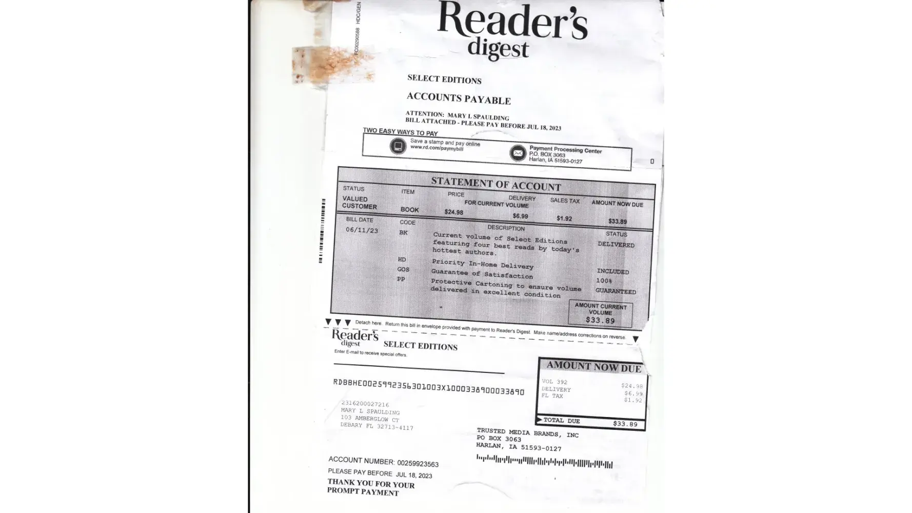 Reader's Digest sends me a bill every month for a subscription I've already paid. This has been going on for at least ten years now. I finally got in touch with a customer service rep about this last year. (They do exist. You just have to look really, really, really hard!) I asked her why they continue to bill me even though I've paid a year in advance. She said they just always send a bill. It will add to your subscription each time you pay it. I asked her how I would know when my subscription runs out and I really do need to pay it. She said to wait for a bill marked "Account Notice" in red. That's rediculous. I'm not paying another bill from them, even if it's marked "Account Notice". It's so thoughtful of RD to make me wait for basically a past-due notice. Lovely to show off in the mail room at my condos. I'm done.
