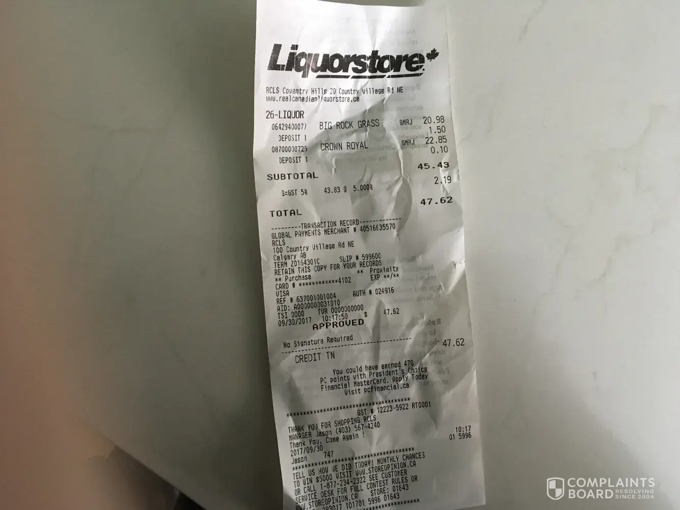 I just purchased a 15 pack of can big rock beer from the Coventry hills 20 country village rd ne location. When I got home I noticed on the box it states a free glass with purchase. I’m disappointed that I wasn’t given the promotional glass, customers shouldn’t have to ask, staff should be giving the promotional products. Transaction record [protected]