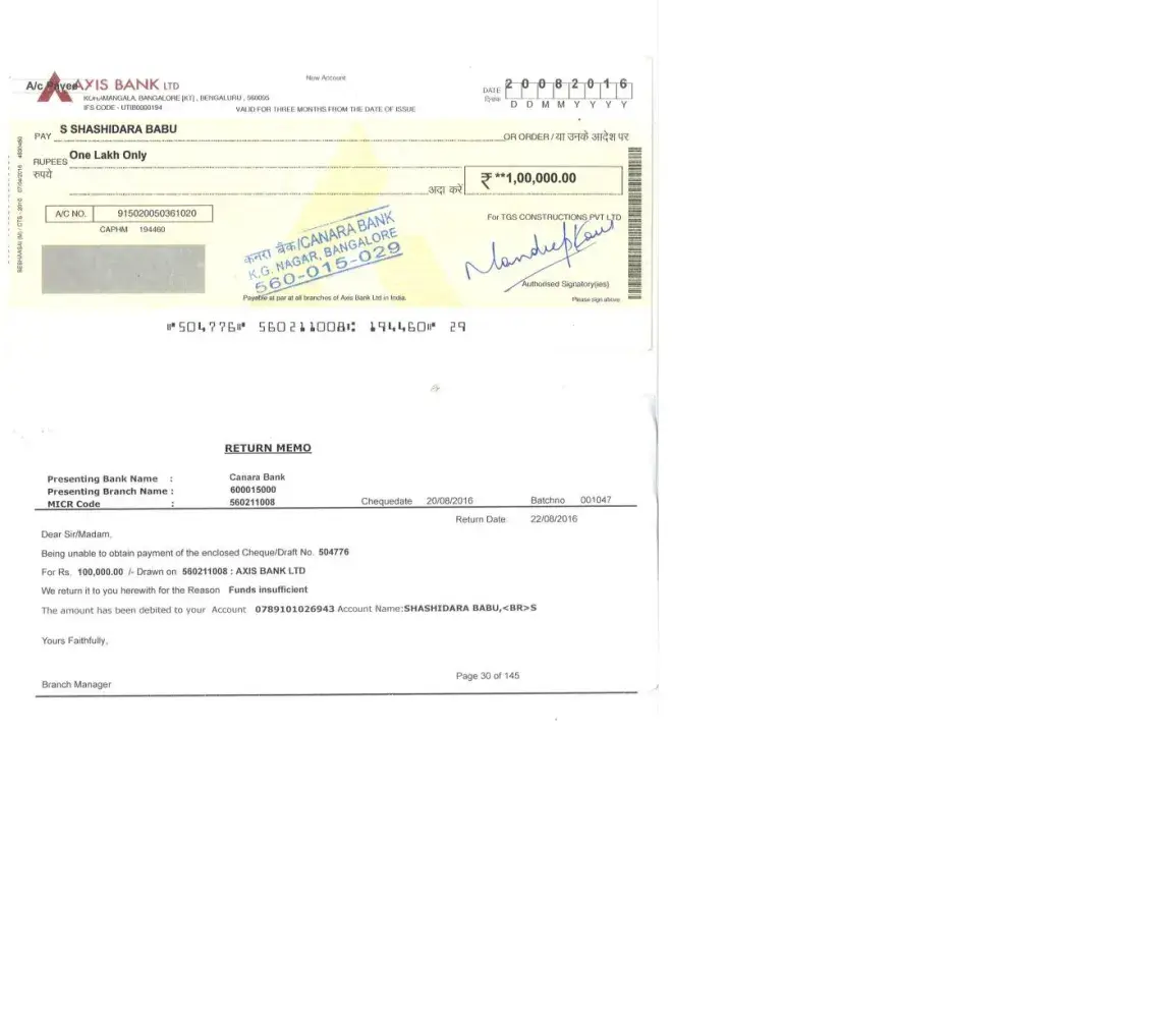 I have paid rs. 1, 00, 000/- advance as booking amount of flat in t g s los angles during june'2016 and taken the copy of document s and shown to the lawyer and said the document are fake don't proceeds and take back the advance paid. then i have cancelled the same and asked to pay back my money. they took 45 days and issued the cheque bearing no. 504766 dated 20.08.2016 for rs. 1, 00, 000/-, when i presented the same got bounced funds insufficient. now after two months also they did not given the dd or cash for same. the employees are very careless and they did not bothers about the customers. now the sales person also not lifting the mobile. what i have to do now. till date they are not paid a single penny refund. whether i have to proceed legally . tgs and dreamz are sister concern and they are cheating a lot of persons in bangalore, no one is there to ask them.