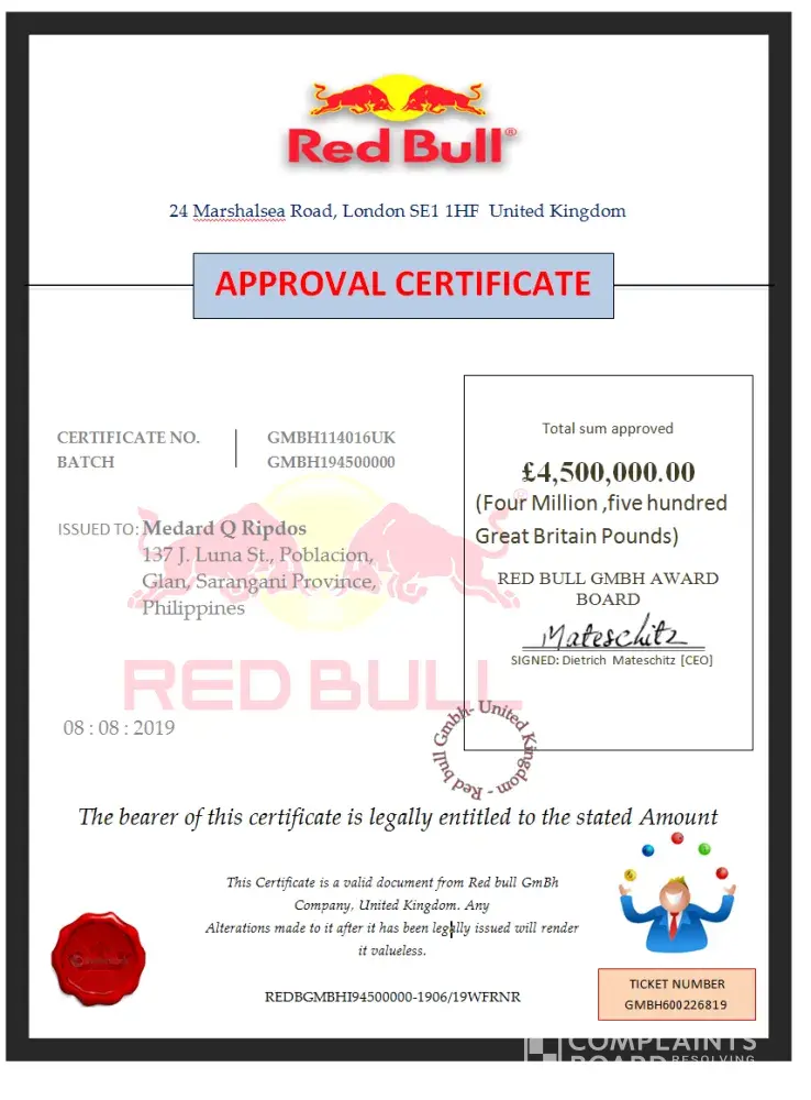 I write to apply for the release of my fund with regards to the Winning Notification that was received on my E-mail ID with PIN NO: 7RBC3580021 from Red Bull Company United Kingdom [RBC].I was made to believe that my prize Cheque of 500, 000.00 GBP is deposited in your office Account I hereby request that the above mentioned sum be remitted to me at the earliest in my country without any delay.