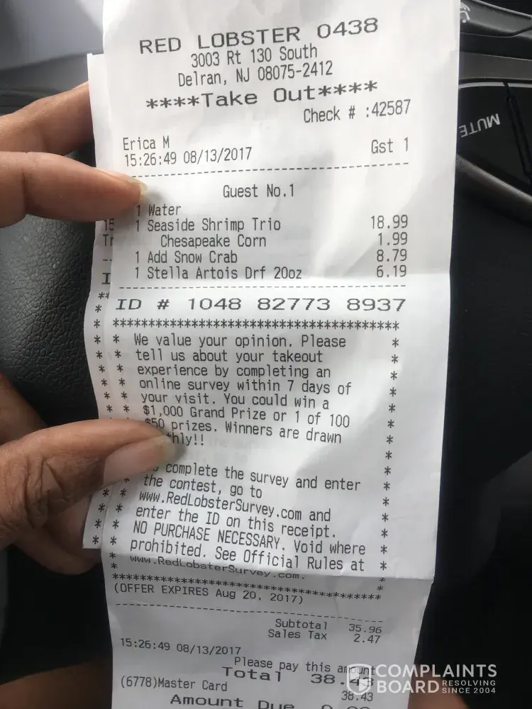 Good morning yesterday I went to your Red Lobster at approximately 2:58pm and set at the bar to order my meal for take out and while I waited I wanted a Stella Artois, just to let you know I set there for about 20 mins before even being acknowledged Amit wasn't from the bartender a server had passed my twice and came to finally ask has anyone helped me! My answer was no! Now I'm looking in the kitchen, and I can't be missed several plates where taken out. The manager on duty came through numerous of times, they were having great laughter and fun, but apparently no asked for a drink from the bar, so I was never noticed! This being my 2nd time at this Red Lobster to give them another shot is very disrespectful and everyone in customer service should know the 3 second rule! Once again worse customer service ever! I was so upset I New I did not want another drink so after I ordered I just paid! I order the Seaside Sheimp trio which was not bad with a side of corn and a side of snow crabs. The snow crabs where the worse pocked I've seen in history very disturbed again! Just wanted you to know because Red Lobster is one of my favorite places, but this Delran Red Lobster needs to step up there game! I still tipped accordingly regardless of how bad the service was
