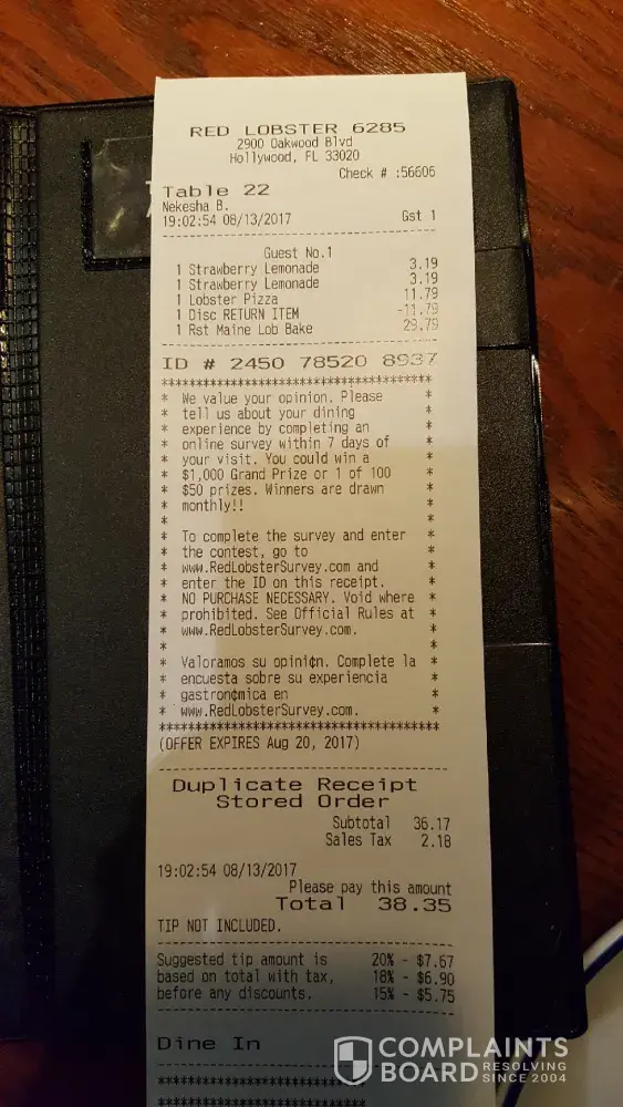 I visited your restaurant located Oakwood plaza in Hollywood fl we order two strawberry lemonade a lobster pizza and a Maine lobster bake when I got my lobster pizza which I order every single time and know what to expect when it came to the table I noticed that it had lemon seeds on it not just a couple a LOT so I told the waitress and she took it back and said she will have them make a fresh one so about 15 minutes passed and she brought out the Maine lobster bake and the lobster pizza so I noticed the pizza slices looked like the old ones and the pizza had way too much cheese on it so as I start looking closer you can tell it was the old pizza that they took they seeds off and just added cheese on top the tomatoes were brunt the lobster was like rubber and the basil was brunt like I said this is the only thing I eat from ur restaurant and I know what to expect and know the Maine lobster bake the lobster was way over cooked it was also like rubber it's sad when a restaurant deceive customers just to save a few dollars.