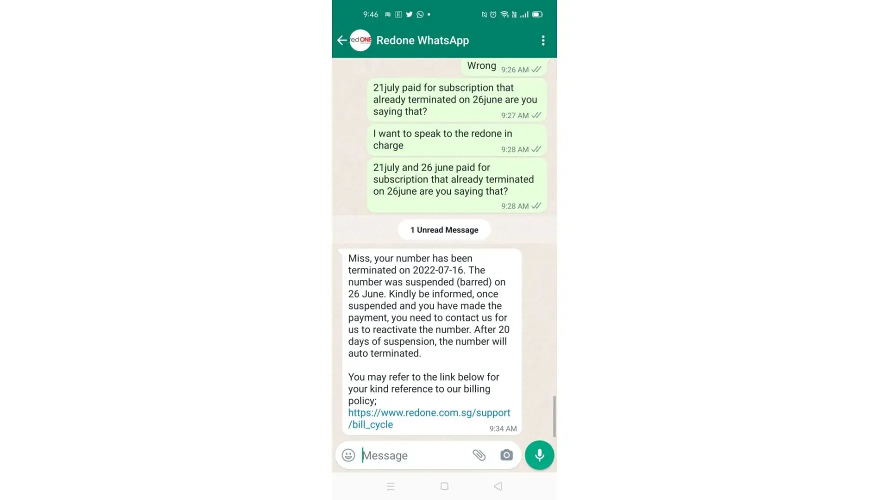Good afternoon. I have received call from Red one yesterday (21.11.2019) (014-5803265). I want to express my dissapointment about the behaviour of your customer service (Debt collector). The way the collector speak is very rude and speak in very unprofessional behaviour. I have change my plan from Redone to Digi on 25 September 2019. When I rechecked my email, there a Redone bill invoice date : 1.11.2019 and due date of the bill is 30.11.2019. I call redone customer service helpline [protected]) to ask regarding this matter and she explain to me that there are pending payment because I change my plan before the bill generates (She said this generates on 1.10.2019). I decided to pay instead. But I still unsatisfied regarding your Customer service (Debt collector) manner when talking to customer. If this is the way Redone providing service, I believe your company will lose lots of customer in the future. Im writing to encourage you to improve your customer service in the future. Thank you.