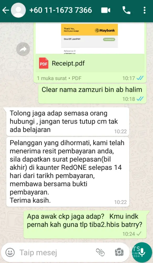 Complaint saya sudah bayar yang baki tunggakan semalam, tapi pagi ni pegawai redone masih hubung saya dan suara tinggi dengan saya, awak hutang redone lagi takmau bayar, kelmaling dulu pun Masa saya tugas pun sama, pegawai redone suara tinggi cakap kurang ajar
