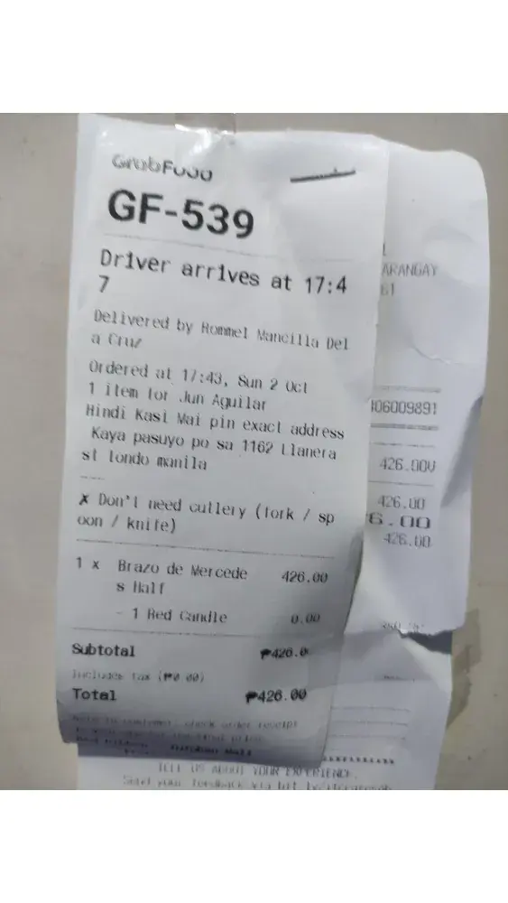 1xBrazo De Mercedes half amounting to 426 pesos plus 49 delivery charge total is 475.How come that the cake was delivered was so small?Ive checked your website and the cake amounting to 426 should be delivered to us in full size not the small one. they description and amount differs from the cake delivered to me.Ive already report this to grab and to you fb website but no avail.to response.That was my brothers birthday and it was so dissapointing .