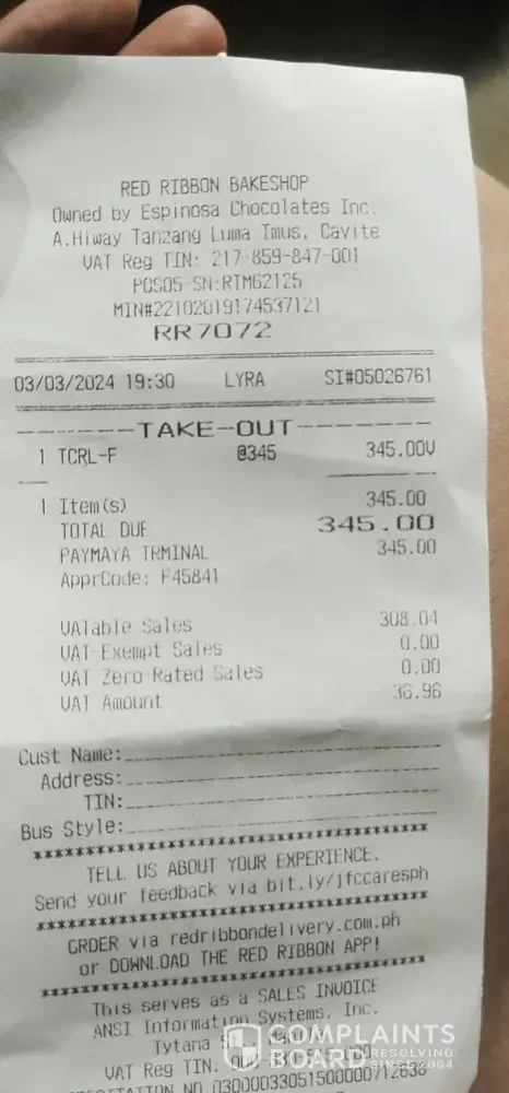 Read full complaint and 1 commentIs Red Ribbon Bakeshop Legit?
