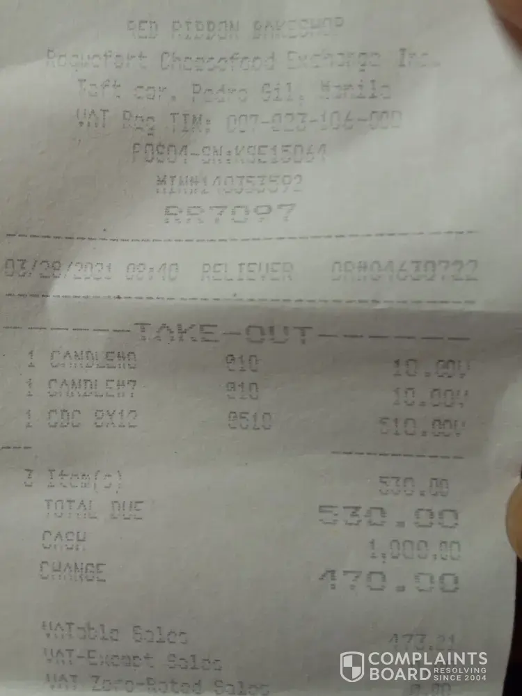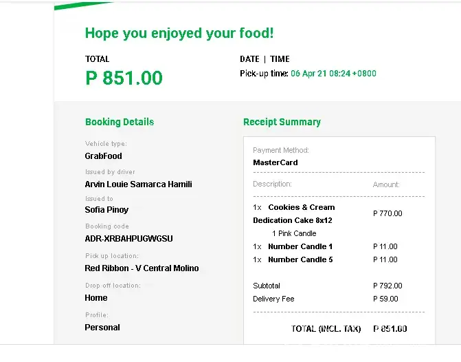 Omorder yung ate ko ng cake thru food panda sa red ribbon la salle last april 19 dahil birthday ko bayad na yun thru gcash pero walang dumating na cake sakin. Pumunta ako sa store ng red ribbon para magcomplain pero ang sinabi lang nila si food panda na yung may kasalanan don ni hindi nila alam kung napick up ba ng rider yun o hindi. Pumunta ako don para sana makuha yung details ng food panda rider pero wala sa log book nila. Ang tanging binigay lang sakin is yung resibo ng transaction nila sa food panda. Wala man lang way yung manager para ma actionan yung complain ko. Ni hindi man lang tumawag sa food panda regarding sa complain ko.