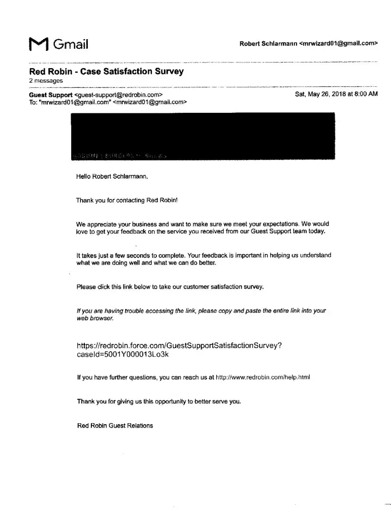 You can contact Red Robin Corporate on Facebook, Twitter or instagram. You can also go to their website, click on HELP and then on Restaurant Feedback.
