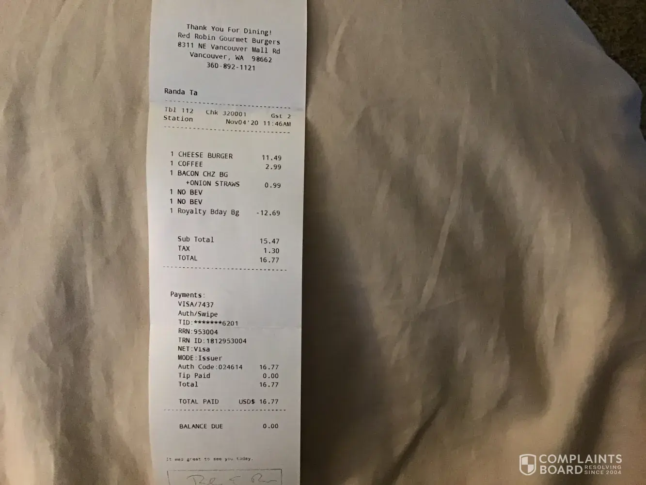 Date of visit: 11/04/20 We were at Red Robin Vancouver Mall Drive in Vancouver WA. today for my wife's birthday. We got her free Birthday Burger and a burger for myself. The food came barely Luke warm. We complained and our server didn't even offer to have the meals recooked. Service was good aside from that. Our last few visits have been very...