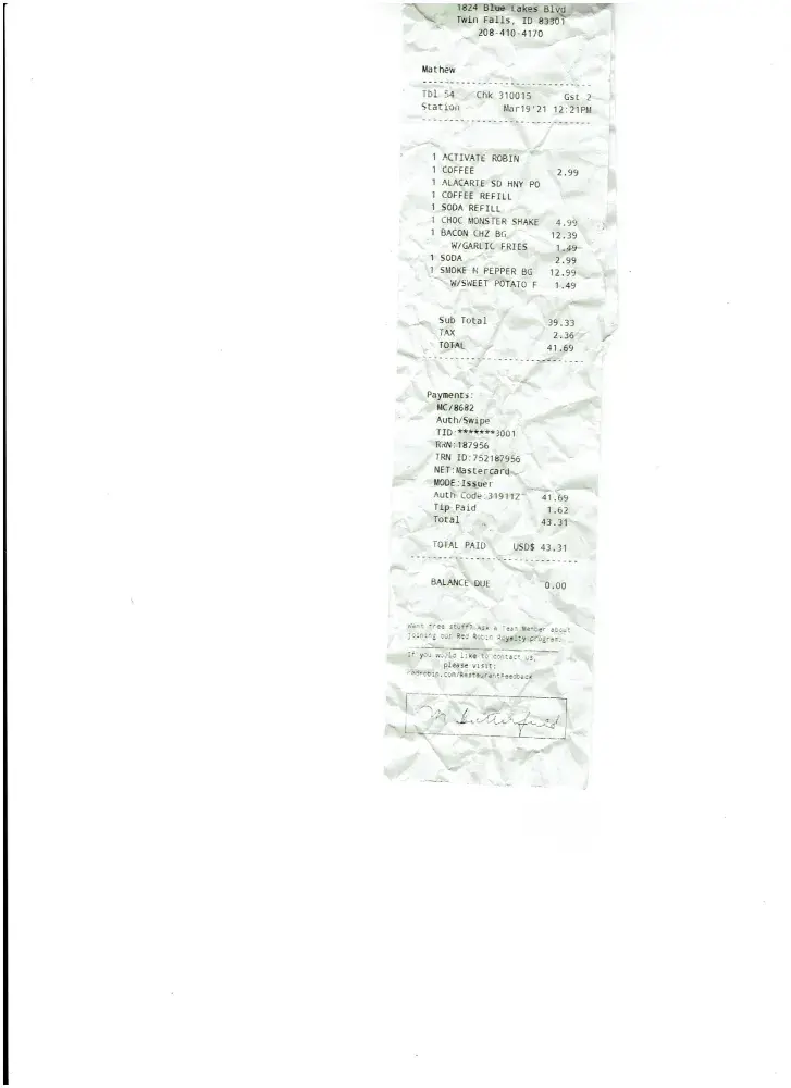 I am including the ticket, so you will see what we ordered: however, I ordered a cup of coffee, which I had to ask for several times after the other drinks were served, with my daughter going back to the waitresses and still no coffee. The "monster shake" was definitely not large, the Coke was mostly ice and I finally got my coffee after the shake and drink were finished. Upon ordering food my daughter asked if they could substitute garlic fries and sweet potato fries for the regulars, the waiter said sure.