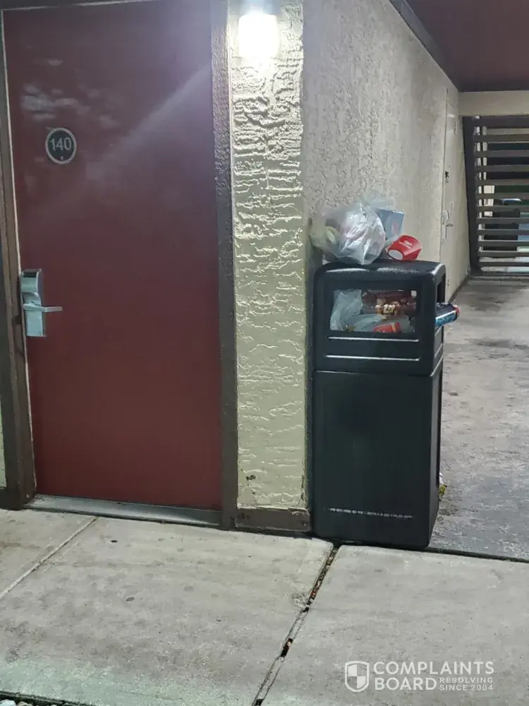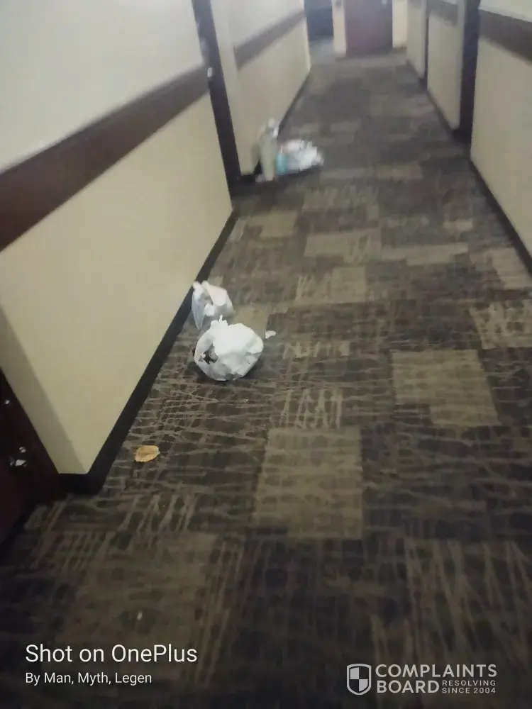 There was trash piled in the hallways, my bed didn't have pillows on it my room phone did not work the TV remote did not work. There's a lampshade missing off the lamp by the beds the bathroom lights did not work it was completely dark and wasn't able to see. There were no towels in my room I asked the front desk for towels and she stated that they did not...