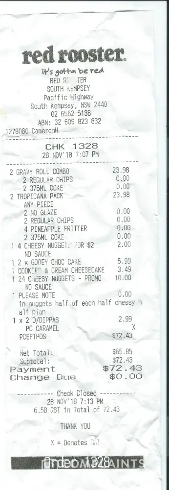 We went to our local Red Rooster at Kempsey last night and as you will see from attached receipt spent $72.43. It took along time to gather order, understandably as it was large. The young boy on the cash register got the cheesecake and 4 cans drink for us. The girl packing order, eventually came and gave us one bag, and I said is it all in there, desserts and all, and she said yes. We thought it looked to small to contain everything so we pulled it all out and checked it. We found two chicken gravy rolls missing, two gooey chocolate cakes missing, box of 4 cheesy nuggets missing and caramel sauce for the donut dippa dessert also missing. We also had for some unknown reason 6 small chips instead of 4. I have never had an order so wrong with so much missing before. It was soon sorted, but when we got back to car we realised the box of 4 cheesy nuggets were still missing so had to go back again. I can tell you I will never go back there again. The girl doing the order had the missing chicken rolls sitting next to her with the choc cakes and the man fixing up order went and got them, no apologies from her or anything. On receipt under nuggets it says no sauce, we weren't asked if we wanted any and if we knew we could get some sauce we definitely would have. I suggest you get someone high up to go get the staff there to do their job properly. One very unhappy no longer customer.