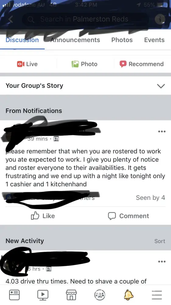 Unfair workplace manager thinks she deserves three days advanced for a sick day we called in an hour ago The manager answered an said "Red rooster Palmerston my name is Brandon" we said hi Brandon I can't come in tonight because I am doing something with my father "He said [censored]you" and hung out with no confirmation that he acknowledged and thenAnother manager posted on Facebook group "i'm sick of staying up and doing rosters just so you can call in sick and hour before your shift" even though we gave three hours notice in the employee contracts we are legally supposed to give two hours so they have time to give somebody one hour notice as in the employee contract. This is one of many complaints that I will be putting towards Red rooster to Palmerston Michelle and Brandon.