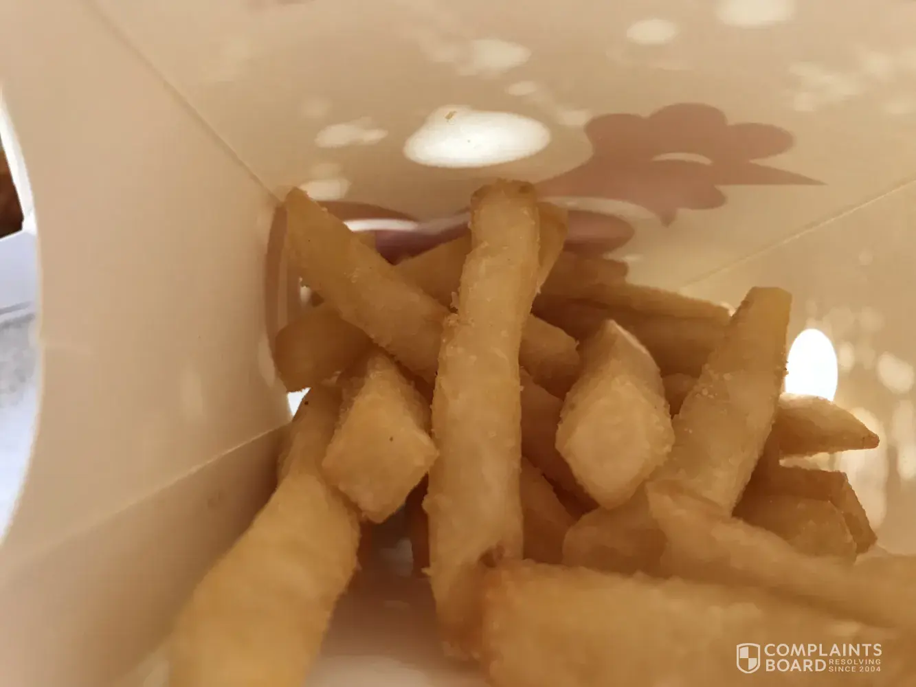 I am complaining about the quality of the chicken/chips pack I just brought home from the Karrinyup Shopping Centre food hall. I ordered a pack of chicken and chips on a wing, upsized for larger fries and a drink. I paid $12.50.