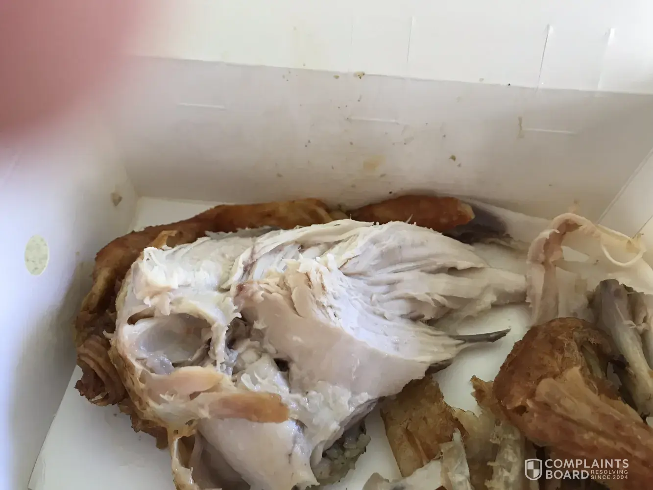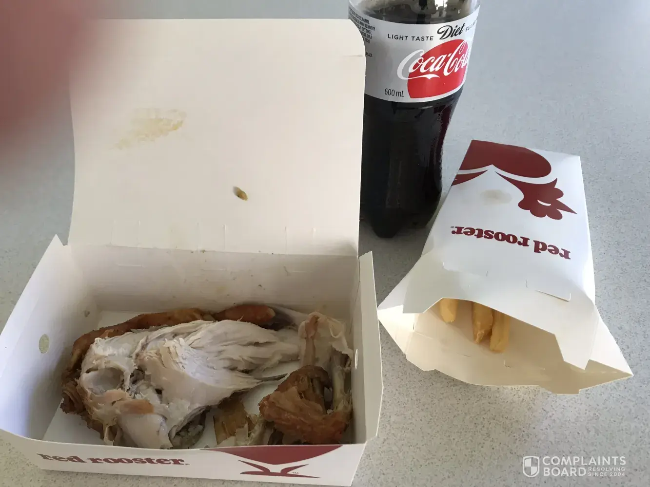 Went to he Kallangur Red rooster store, and ordered a whole chook. After asking the counter staff to cut the chicken in to 4, I was handed a box and when home. On arriving home I opened the box and found 3 drum sticks and 2 wings. No other chick. Living to far way to head back I was stuck with the scraps I was given.