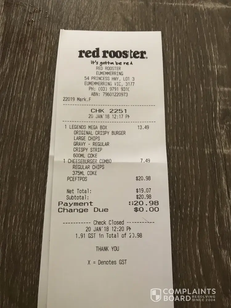 I ordered a delivery from Red Rooster in Pascoe Vale on Sunday evening (28/1/18), just like I have many times before.