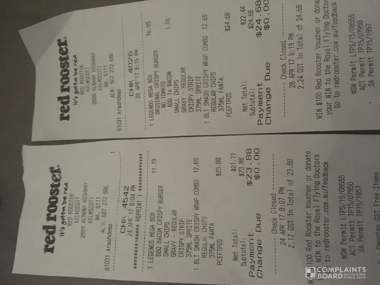 I do have email conformation of this. I am asking for compensation for the meal i have ordered from red rooster and the meal i had to order because of the mistake.