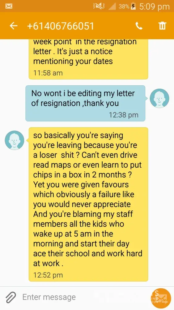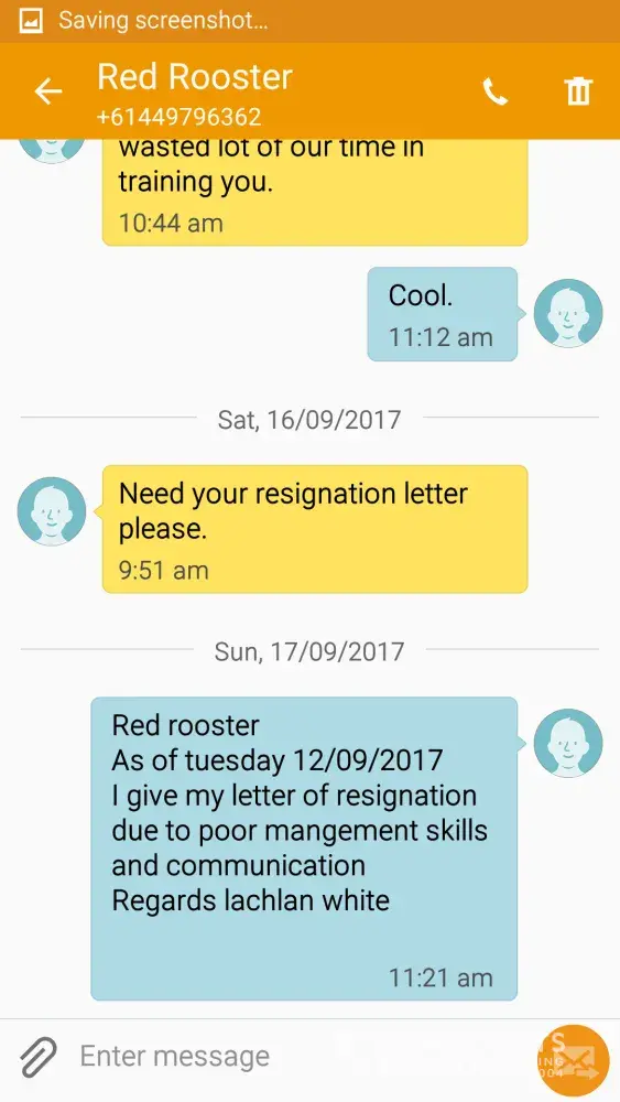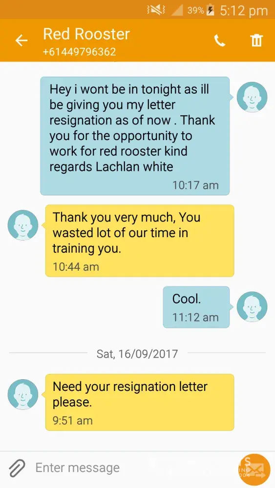 After a few days lachlan text ibrahim on face book asking if he was able to work in the kitchen rather than doing deliveries, as he felt the delivery was not to the standed and fast pace in which the management team wanted. After a week there was no response, so lachlan personally text the owner of his resignation, due to poor communication skills with the management. Lachlan has shown respect and maturity through this ordeal, though I can not say the same for the red rooster management team. I have kept text messages through the letter of resignation procedure with words that said that my son lachlan was a loser [censor]...