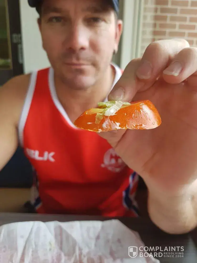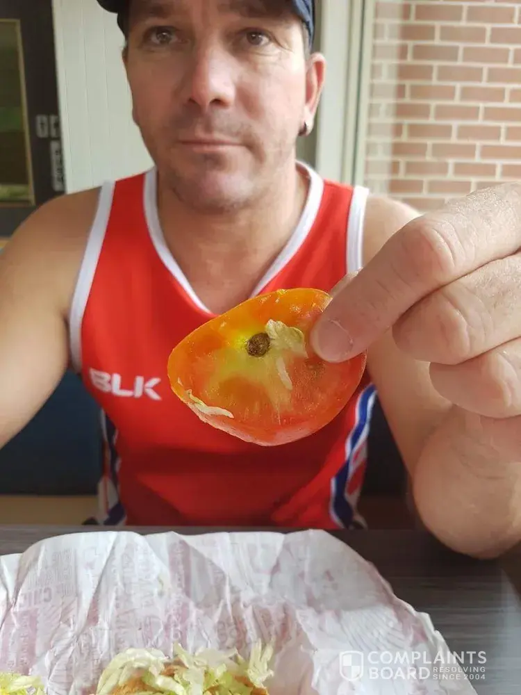 Please find out who was on shift today the 19 March 2017 and talk to them to make sure they are going to to do their jobs, I recieved the top hard piece of a tomato on my burger and also a chunky piece.