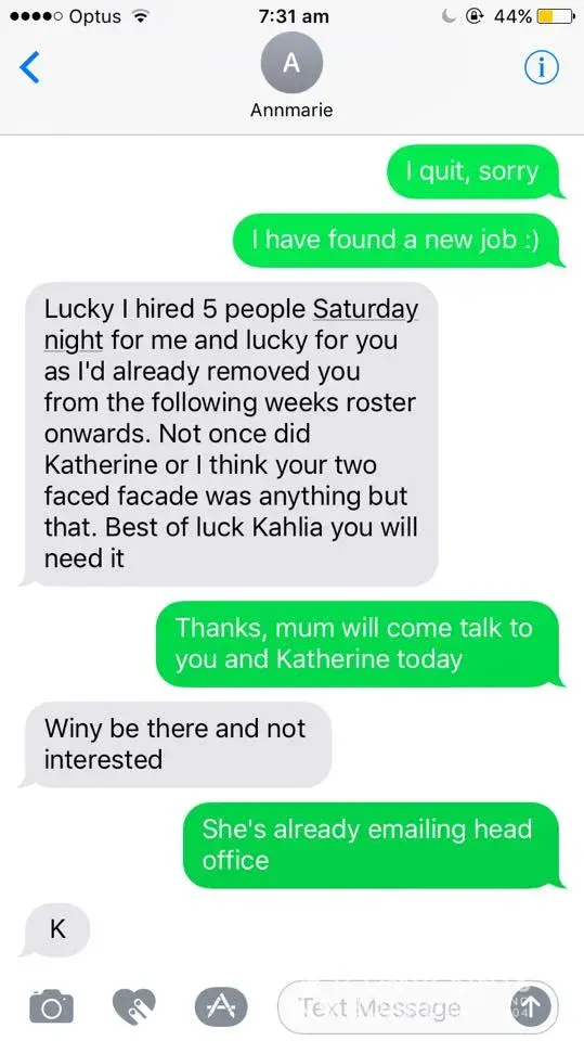 "Lucky I hired 5 people Saturday night for me and lucky for you as I'd already removed you from the following weeks roster onwards. Not once did Katherine or I think your two faced facade was anything but that. Best of luck Kahlia you will need it"