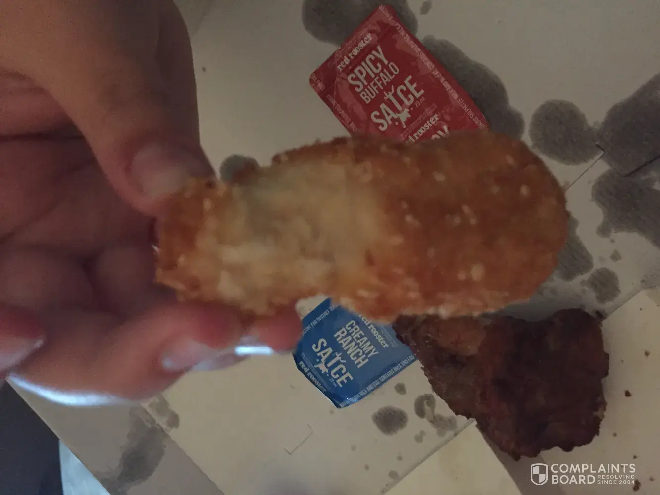 We ordered the dippers box tonight & were unhappy when noticing the potato gems were almost burnt & tasted burnt. And then my daughter went to eat a cheesy nugget & noticed 2 nuggets stuck together bonded by a thick piece of stringy chicken grissle.