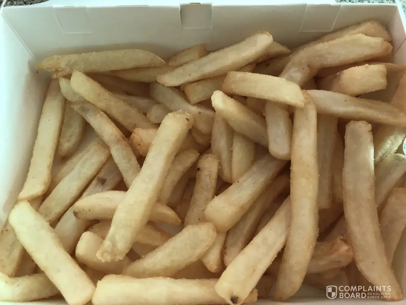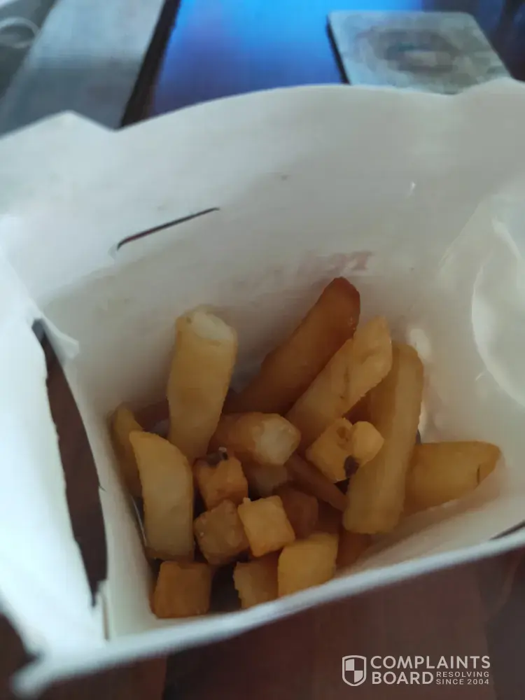 As the photo shows, the chips really look undercooked. I was prepared to wait for hot chips but they were served almost immediately, which is very suspect.