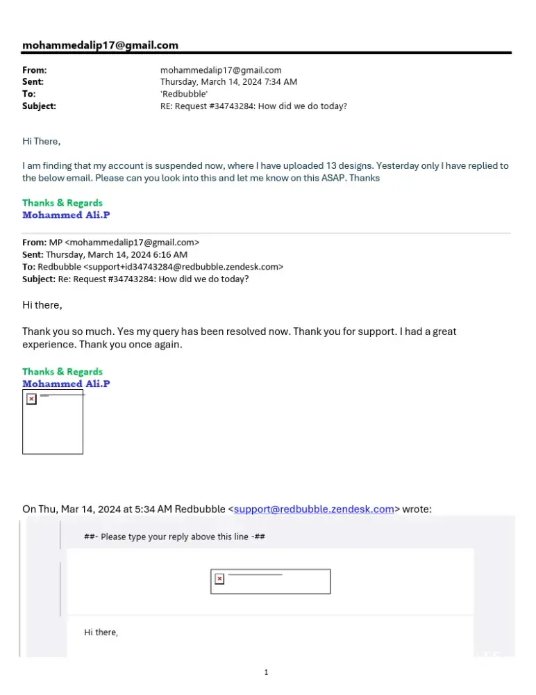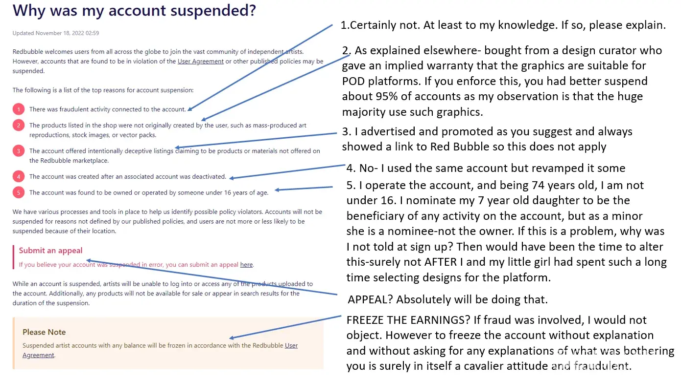 So, RedBubble never answers the appeals and I doubt that any suspended accounts are reinstated.