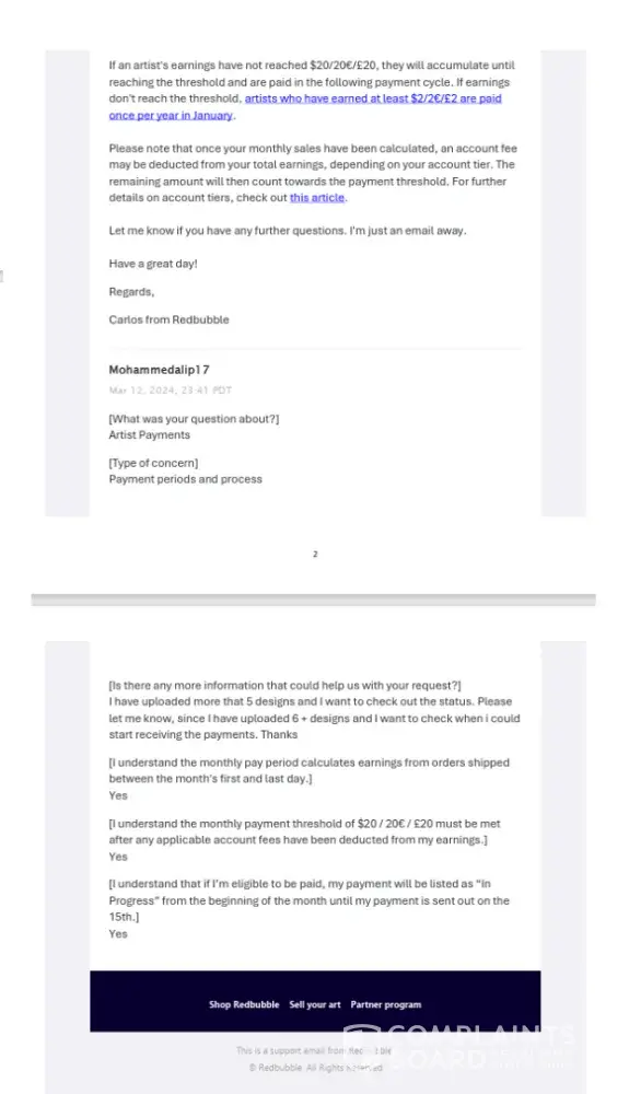 We opened an account on RedBubble on 3 Mar 2023, set everything up, uploaded our logo, and started working on products to sell. I ordered a few different items as samples and waited for the review of the account to be complete so we could go live and start selling. On 10 Mar 2023, we received a generic message that our account had been suspended with ZERO information as the why. I submitted an appeal and requested additional information and only received confirmation that the account had been suspended - again with no reason being given. I submitted a request to have the account closed yesterday, 22 May 2023, and received word today that the account had been closed but they also said for us not to open another account or it would be shut down immediately. STILL no reason being given for this poor treatment. I submitted a request for information to the email address the final notice had included and came here to provide feedback for other potential customers/artists to save them the time and aggravation in dealing with this company. Find a different company and dodge this place. The sooner they’re put out of business, the better.